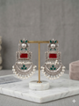 Elevate your ethnic wardrobe with these stunning oxidized silver earrings. Featuring intricate artisan craftsmanship, these earrings are adorned with vibrant ruby-red and emerald-green stones and finished with delicate white pearl drops. Perfect for weddings, festivals, or as a statement piece for a classic boho look, these earrings offer a timeless vintage appeal that complements any traditional outfit.