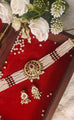 Steeped in regal tradition, the Rani Meher Choker Set is a true expression of royal elegance. Crafted in classic Jadau style, this choker features an ornate central medallion adorned with rich ruby and emerald-toned stones, framed by intricate gold detailing. Multiple strands of delicate pearls rest gracefully along the collarbone, creating a silhouette once reserved for queens. The matching earrings mirror the same royal artistry, finished with soft pearl drops.